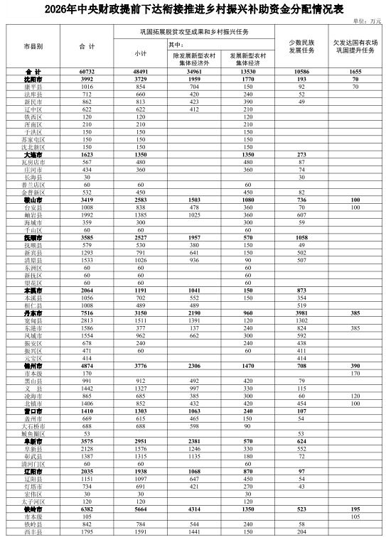 2026年提前下达中央财政衔接推进乡村振兴补助资金分配情况公示