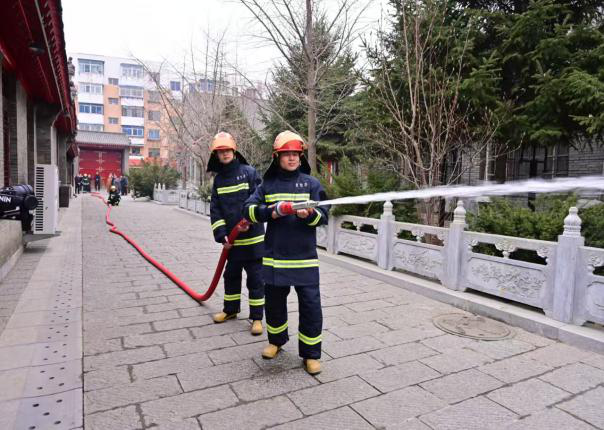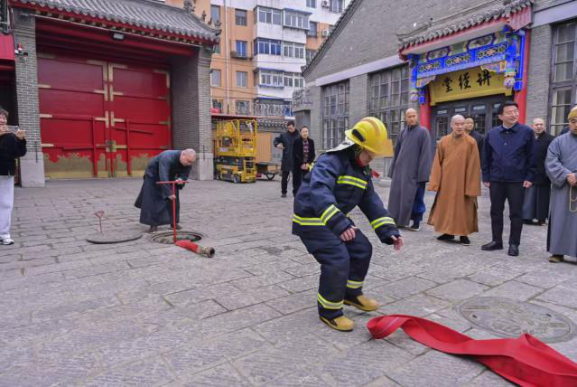 慈恩寺历史悠久、信众众多,属沈阳市重点宗教活动场所。此次演练模拟了寺院突发火灾的场景、应急数字化平台,涵盖了火灾报警、人员疏散、初期火灾扑救等多个环节。演练过程中寺院僧人反应迅速、配合默契,严格按照预定方案有序开展各项应急处置工作,熟练操作消防水带,精准对准火源进行喷射。